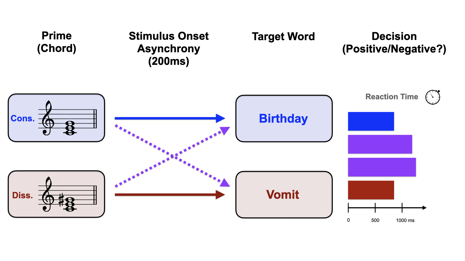 A very useful method to dig deeper into the underlying mechanisms behind emotional connotations to musical chords is a method called ‘affective priming’. Borrowed from social and cognitive psychology, it offers an objective and automatic measure of affective processing and it bypasses many of the obstacles related to semantics present in mere self-reports. It essentially brings some much-needed objectivity to a question that is notoriously prone to armchair theorising and (over)generalising without very much data. The affective priming method consists of two stimuli (the prime and the target) presented in quick succession. The extent to which the first (prime) stimulus influences responses to the second (target) stimulus is indexed by a reaction time and an accuracy rate. Target stimuli are typically evaluated more quickly and accurately when preceded by a prime of the same affective category (known as congruence) compared to when preceded by one of the opposite category (known as incongruence). The useful thing about the affective priming method is that it taps into unconscious, automatic responses. The participants simply do not have time to consciously consider their responses: if a preceding prime’s emotional quality spills over to the ensuing target word’s classification speed and accuracy, this is taken as evidence of the prime’s (in this case a chord) positive/negative emotional charge.