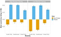 Summary: This paper examines audience judgements of interpersonal synchrony in musical duo performances via global (retrospective) ratings of 10-second excerpts and continuous (on-line) ratings of longer excerpts (~ 30 seconds to 1 minute). Participants perceived standard jazz improvisations featuring a regular beat as significantly more synchronous than free improvisations that aimed to eschew the induction of such a beat. However, ratings of perceived synchrony were more similar across these two styles when only the visual information from the performance was available, suggesting that performers’ bodily cues functioned similarly to communicate and coordinate musical intentions. Computational analysis of the audio and visual aspects of the performances indicated that synchrony ratings increased with increases in audio event density and when co-performers engaged in periodic movements at similar frequencies, and the salience of visual information increased when synchrony ratings were made continuously over longer timescales. These studies reveal new insights about the correspondence between objective and subjective measures of synchrony and contribute methodological advances indicating both parallels and divergences between the results obtained in paradigms utilising global versus continuous ratings of musical synchrony.