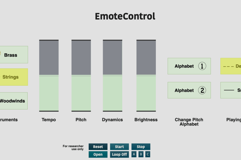 One of my research projects involved looking at how different musical features such as tempo and loudness are used to embed different emotions in a musical piece. This was attained by letting music listeners themselves show me how they think different emotions should sound like in music, by asking them to change instrumental tonal music in real-time via a combination of six or seven musical features using a computer interface I created called EmoteControl. This work identified how different combinations of tempo, pitch, dynamics, brightness, articulation, mode, and later, instrumentation, helped convey different emotional expressions through the music.